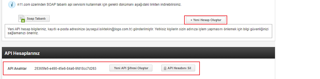 Yeni bir api hesabı oluşturmak için de Yeni Hesap Oluştur butonuna bastıktan sonra ekranın alt bölümünde görünen api hesaplarınızın içinde api anahtarınız oluşacaktır. Api şifreniz mail adresinize gönderilecektir. Bu işlemlerden sonra entegrasyon işlemlerinizi başlatabilirsiniz.
