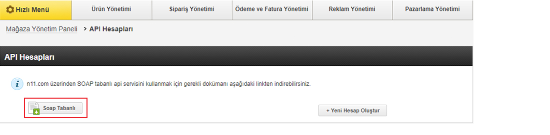 Api dökümanlarına ve api hesaplarınıza ulaşmak için Satıcı Ofisi > Hesabım > Api Hesapları butonuna basın.