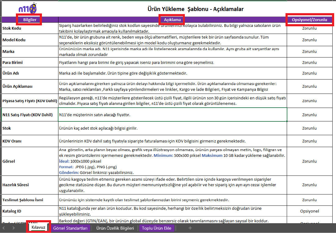 Excel şablonunuzu indirdikten sonra ilk olarak Kılavuz sayfasına giderek yükleyeceğiniz ürünler için yazacağınız ürün bilgileri hakkında detaylı bilgi alabilirsiniz.