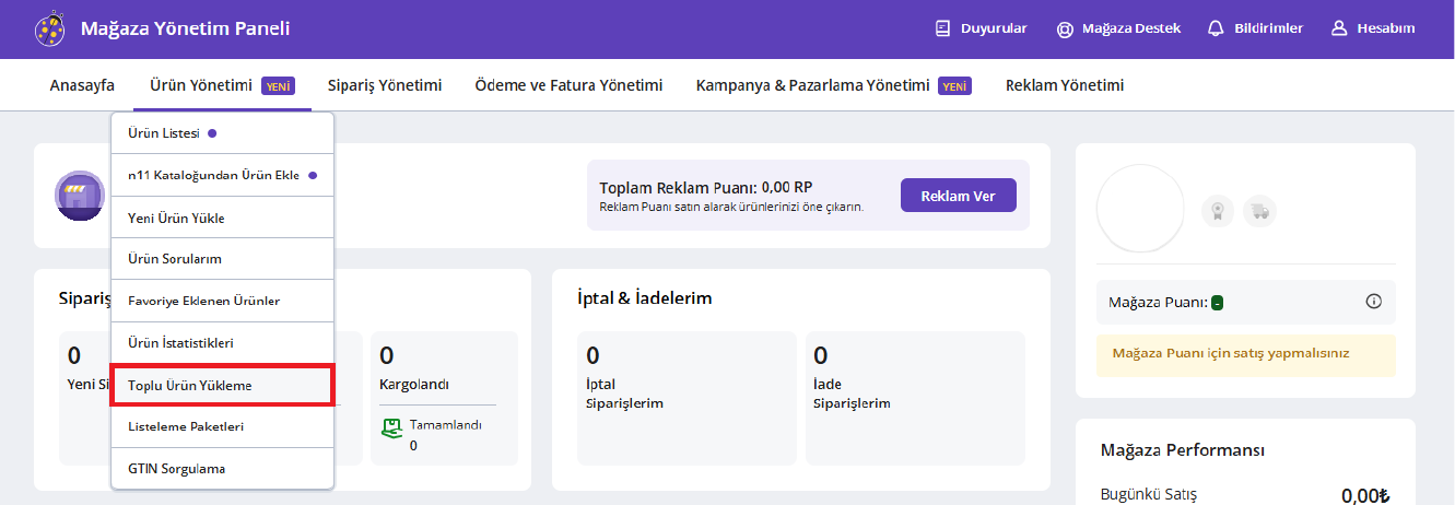 Mağaza Yönetim Paneli > Ürün Yönetimi > Toplu Ürün Yükleme adımlarını takip ederek Toplu Ürün Yükleme sayfasını açın.