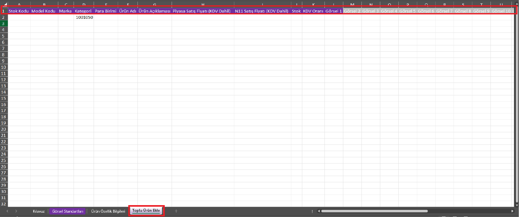 Toplu Ürün Ekle sayfasını açtığınızda yüklemek istediğiniz ürünlere ilişkin bilgileri içeren başlıklar ile karşılaşacaksınız. Bu başlıkların altında yer alan kutucuğa, sırası ile tanımlamak istediğiniz ürün bilgilerinizi yazmanız gerekmektedir. Bu sayfada yer alan mor renkli başlıklar zorunlu yazılması gereken ürün özelliği, gri renkli başlıklar ise opsiyonel yazılması gereken ürün özelliği olarak doldurulmalıdır.
