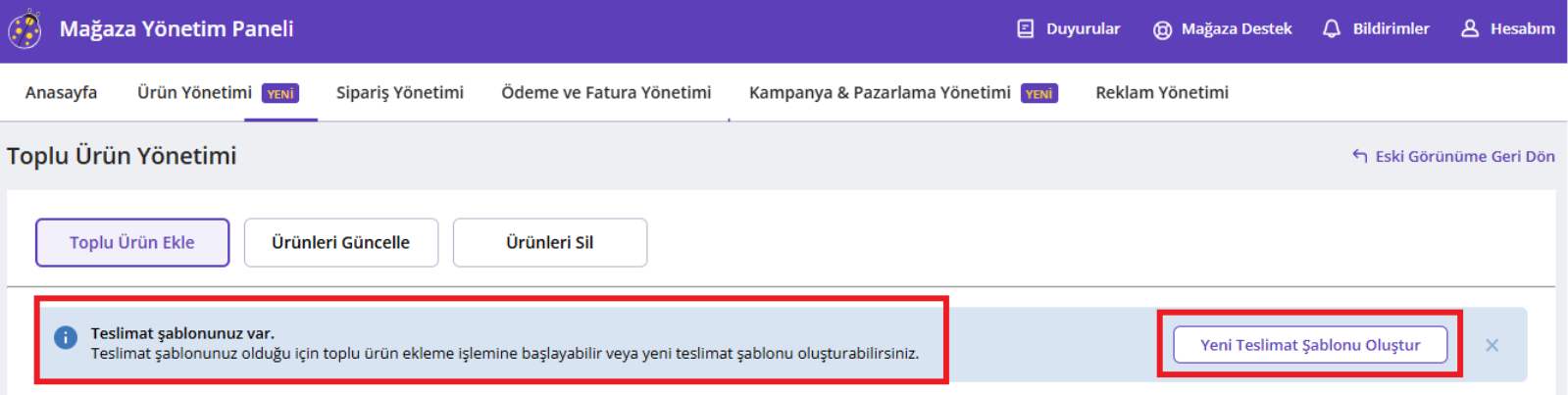Toplu olarak ürün yükleme işlemi öncesinde teslimat şablonunuzun bulunması gerekmektedir. Eğer teslimat şablonunuzu oluşturmadıysanız ilk olarak Yeni Teslimat Şablonu Oluştur butonuna tıklayarak teslimat şablonunuzu oluşturmanız gerekmektedir. Daha sonra ürün yükleme sürecinize devam edebilirsiniz.