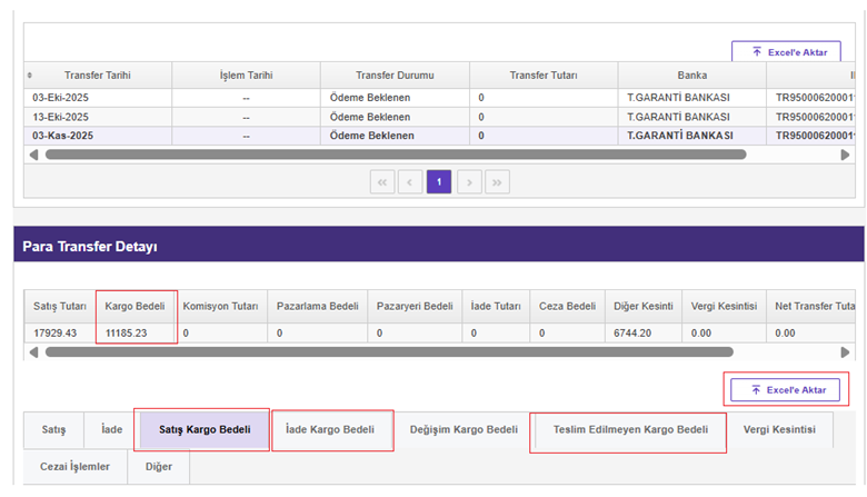 Seçilen tarihler arasındaki detaylı kargo gönderim bilgilerine, Para Transfer Detayı başlığının altında yer alan ödeme detay excelinizi alarak satış kargo bedeli, iade kargo bedeli ve teslime edilemeyen kargo bedeli bilgilerinin detayına erişebilirsiniz.